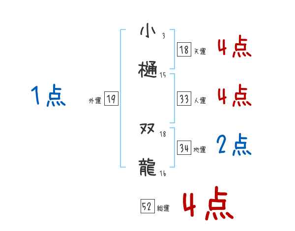 天運![]() | 小樋双龍さんの天運は18画の4つ星!情熱的で剛気。忍耐力があり信頼される。 家系が持つ宿命的な運勢を表します。祖先から受け継いだ苗字ですので自分の力が及びません。家柄を象徴します。 |