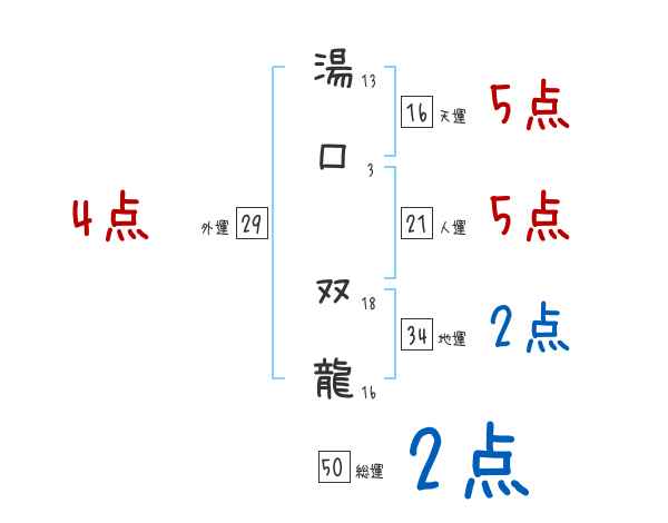 天運![]() | 湯口双龍さんの天運は16画の5つ星!人望が厚く大きく発展する。逆転成功が見える。 家系が持つ宿命的な運勢を表します。祖先から受け継いだ苗字ですので自分の力が及びません。家柄を象徴します。 |