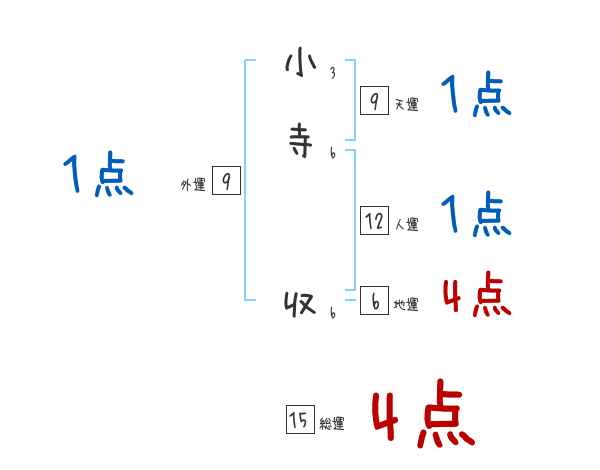 天運![]() | 小寺収さんの天運は9画の1つ星!消極的で才能を発揮することが苦手なことも。周りの意見に耳を傾けましょう。 家系が持つ宿命的な運勢を表します。祖先から受け継いだ苗字ですので自分の力が及びません。家柄を象徴します。 |