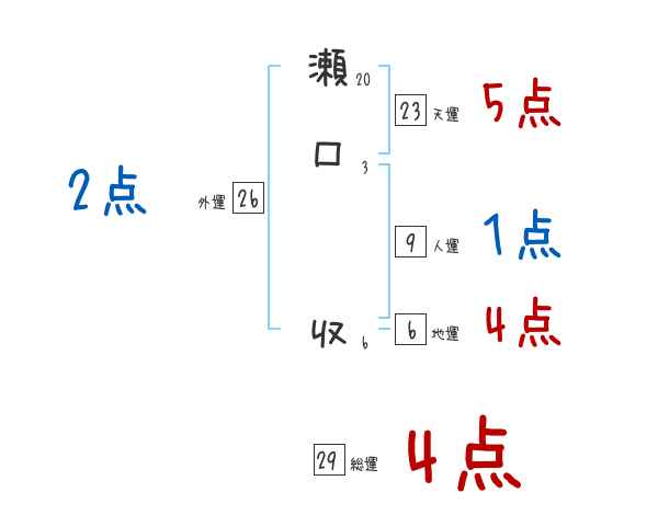 天運![]() | 瀬口収さんの天運は23画の5つ星!想像力に優れ活力がある。一代で成功し名誉を手に入れる。 家系が持つ宿命的な運勢を表します。祖先から受け継いだ苗字ですので自分の力が及びません。家柄を象徴します。 |