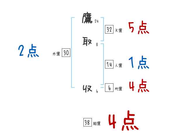 天運![]() | 鷹取収さんの天運は32画の5つ星!柔軟性があり成功する。チャンスが多く金運が良い。 家系が持つ宿命的な運勢を表します。祖先から受け継いだ苗字ですので自分の力が及びません。家柄を象徴します。 |