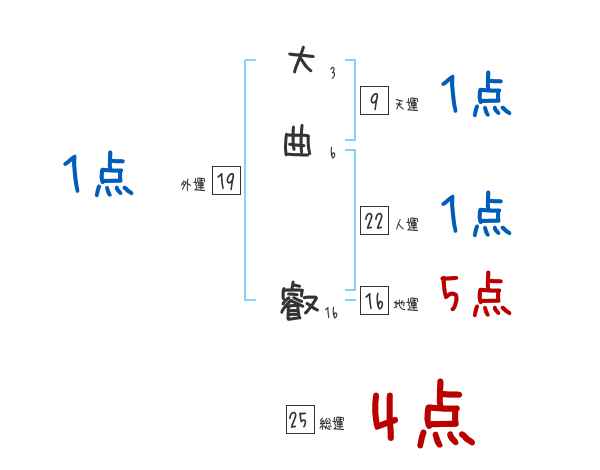 天運![]() | 大曲叡さんの天運は9画の1つ星!消極的で才能を発揮することが苦手なことも。周りの意見に耳を傾けましょう。 家系が持つ宿命的な運勢を表します。祖先から受け継いだ苗字ですので自分の力が及びません。家柄を象徴します。 |