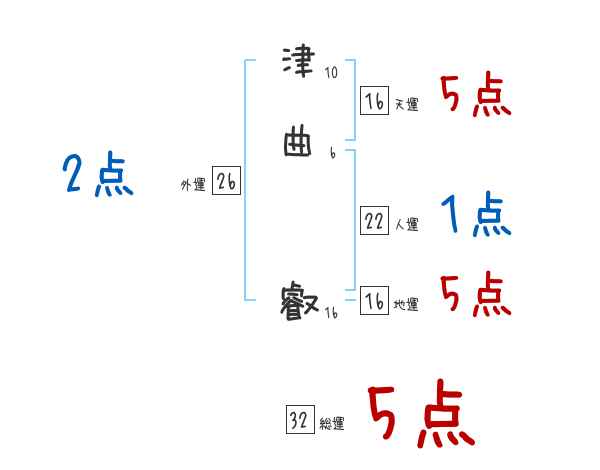 総運![]() | 津曲叡さんの総運は32画の5つ星!柔軟性があり成功する。チャンスが多く金運が良い。 あなたの人生を表す1番重要な運勢です。生涯を通じて影響する総合運となり、主に50歳以降の晩年期に影響を及ぼします。 |