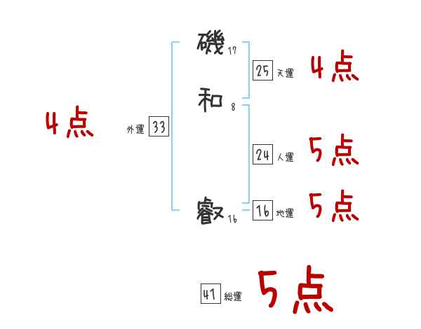 外運![]() | 磯和叡さんの外運は33画の4つ星!権力志向でプライドが高い。勇気があり運を切り開き成功する。 生活面を象徴する運勢です。外部から受ける影響力を表し、結婚運、家庭運や職場、環境への順応性を表します。 |