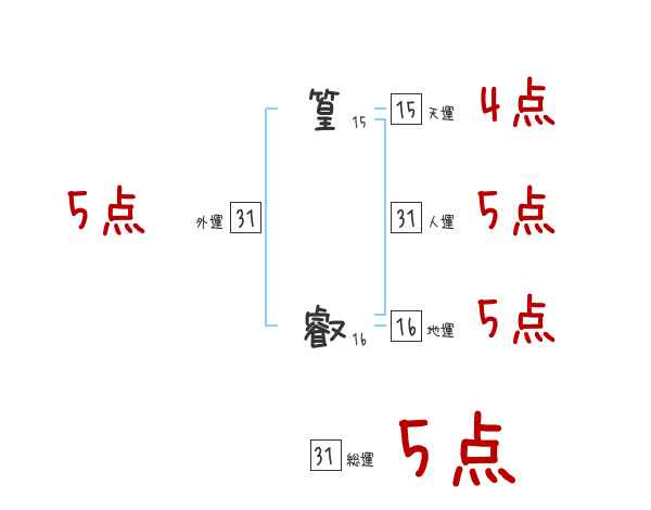 人運![]() | 篁叡さんの人運は31画の5つ星!社交性があり判断力に優れる。順風満帆な人生で円満な生活。 性格や才能などを表す2番目に重要な運勢です。人間関係や協調性、社会的な成功に影響します。主に20歳から50歳ぐらいまでの中年期の運勢を表します。 |