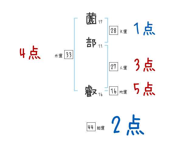 総運![]() | 薗部叡さんの総運は44画の2つ星!誠実で慎重な性格。物事を考えすぎないように注意しましょう。 あなたの人生を表す1番重要な運勢です。生涯を通じて影響する総合運となり、主に50歳以降の晩年期に影響を及ぼします。 |
