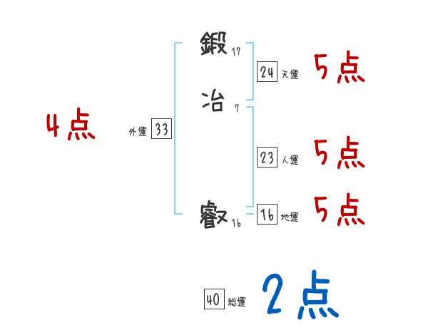 天運![]() | 鍛冶叡さんの天運は24画の5つ星!家庭運が良く順調な人生。金運にも恵まれる。 家系が持つ宿命的な運勢を表します。祖先から受け継いだ苗字ですので自分の力が及びません。家柄を象徴します。 |