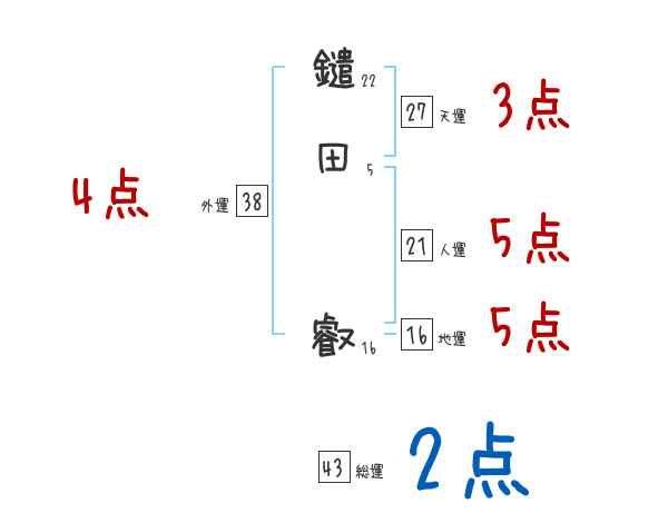天運![]() | 鑓田叡さんの天運は27画の3つ星!頭脳明晰だが強情で摩擦が多い傾向。孤立に注意。 家系が持つ宿命的な運勢を表します。祖先から受け継いだ苗字ですので自分の力が及びません。家柄を象徴します。 |
