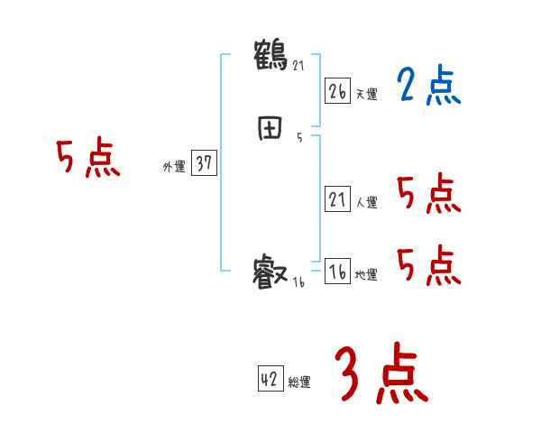 外運![]() | 鶴田叡さんの外運は37画の5つ星!努力家で順応性に優れる。現実的な考え方ができ忠実に物事をこなす。 生活面を象徴する運勢です。外部から受ける影響力を表し、結婚運、家庭運や職場、環境への順応性を表します。 |