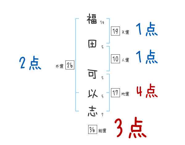 天運![]() | 福田可以志さんの天運は19画の1つ星!優れた才能を持ちますが、協調性が足りないことも。周りの人と協力する事を意識しましょう。 家系が持つ宿命的な運勢を表します。祖先から受け継いだ苗字ですので自分の力が及びません。家柄を象徴します。 |