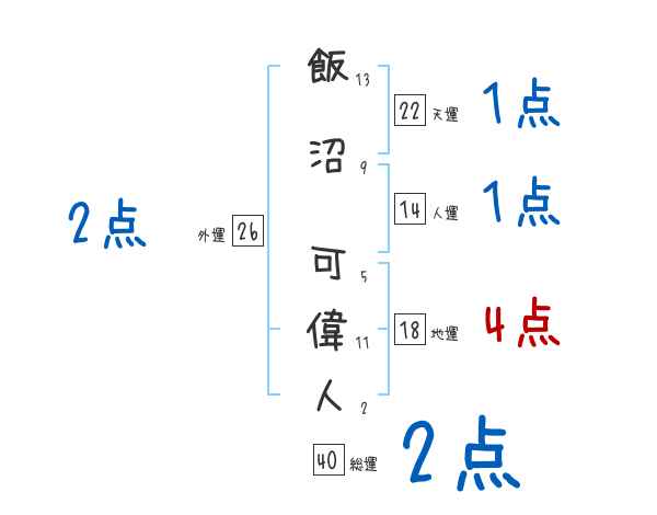 外運![]() | 飯沼可偉人さんの外運は26画の2つ星!波瀾万丈かも。信頼できる人を大事にしましょう。 生活面を象徴する運勢です。外部から受ける影響力を表し、結婚運、家庭運や職場、環境への順応性を表します。 |