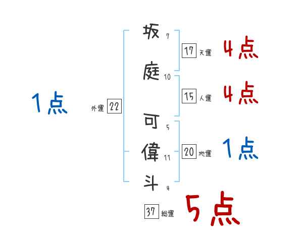 外運![]() | 坂庭可偉斗さんの外運は22画の1つ星!努力することが苦手ないっぽう手先が器用。芸術性にも優れる。 生活面を象徴する運勢です。外部から受ける影響力を表し、結婚運、家庭運や職場、環境への順応性を表します。 |