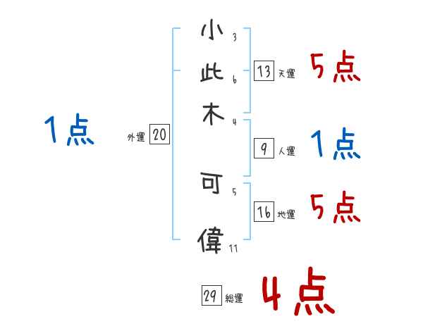 総運![]() | 小此木可偉さんの総運は29画の4つ星!完全主義で才能がある。厳格な心の持ち主。 あなたの人生を表す1番重要な運勢です。生涯を通じて影響する総合運となり、主に50歳以降の晩年期に影響を及ぼします。 |