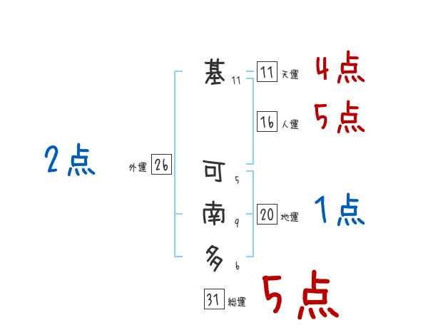 外運![]() | 基可南多さんの外運は26画の2つ星!波瀾万丈かも。信頼できる人を大事にしましょう。 生活面を象徴する運勢です。外部から受ける影響力を表し、結婚運、家庭運や職場、環境への順応性を表します。 |