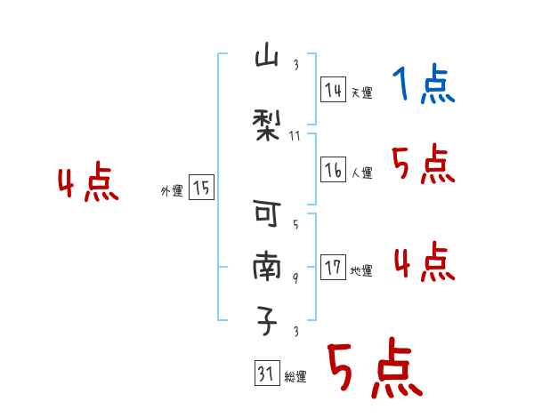 人運![]() | 山梨可南子さんの人運は16画の5つ星!人望が厚く大きく発展する。逆転成功が見える。 性格や才能などを表す2番目に重要な運勢です。人間関係や協調性、社会的な成功に影響します。主に20歳から50歳ぐらいまでの中年期の運勢を表します。 |
