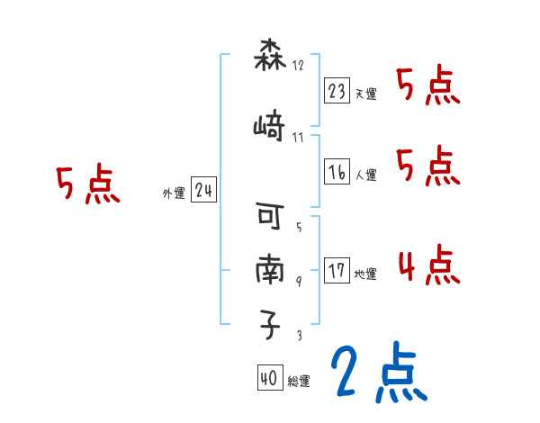 外運![]() | 森﨑可南子さんの外運は24画の5つ星!家庭運が良く順調な人生。金運にも恵まれる。 生活面を象徴する運勢です。外部から受ける影響力を表し、結婚運、家庭運や職場、環境への順応性を表します。 |