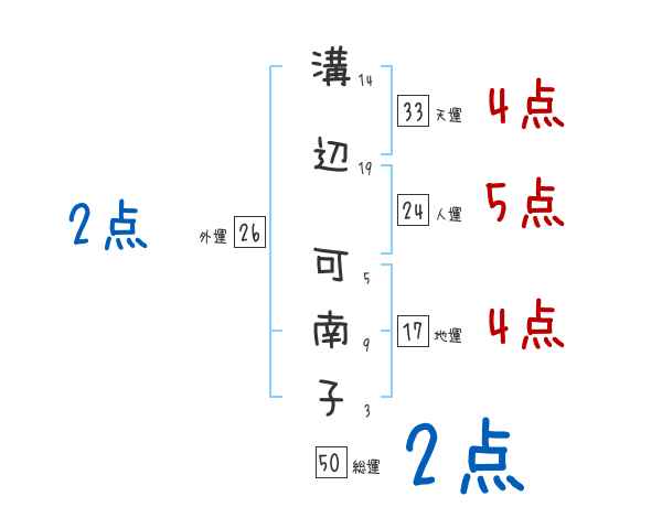外運![]() | 溝辺可南子さんの外運は26画の2つ星!波瀾万丈かも。信頼できる人を大事にしましょう。 生活面を象徴する運勢です。外部から受ける影響力を表し、結婚運、家庭運や職場、環境への順応性を表します。 |
