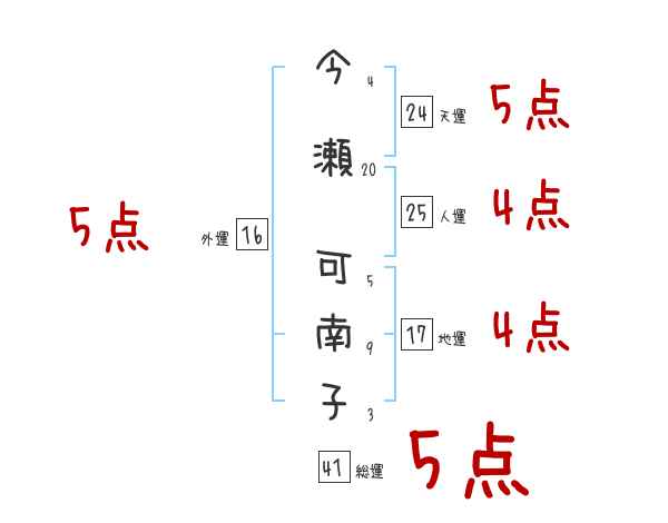 外運![]() | 今瀬可南子さんの外運は16画の5つ星!人望が厚く大きく発展する。逆転成功が見える。 生活面を象徴する運勢です。外部から受ける影響力を表し、結婚運、家庭運や職場、環境への順応性を表します。 |