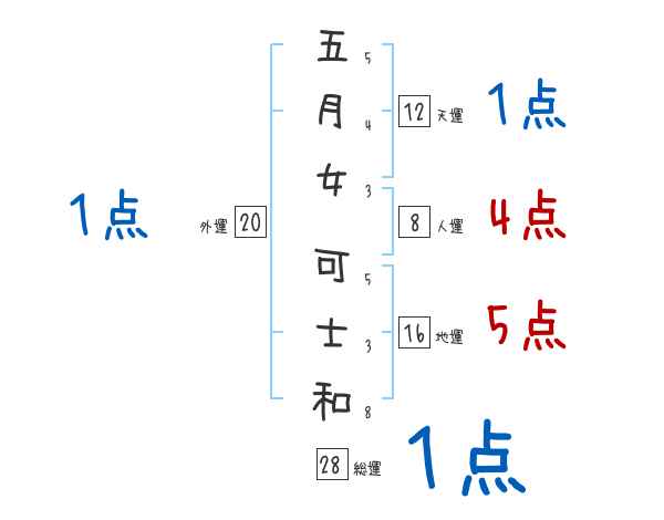 | 地運  | 五月女可士和さんの地運は16画の5つ星!人望が厚く大きく発展する。逆転成功が見える。個性を表す基礎的な運勢です。性格形成や対人関係、行動力など家庭環境に影響されます。主に誕生してから20歳くらいまでの若年期の運勢を表します。 |