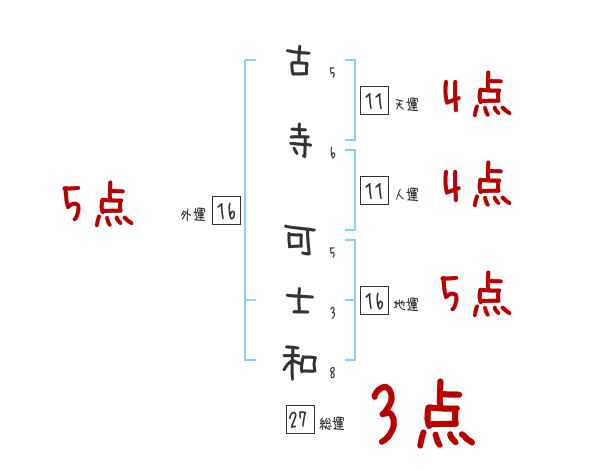 天運![]() | 古寺可士和さんの天運は11画の4つ星!着実に富や地位を得る幸運な人生。 家系が持つ宿命的な運勢を表します。祖先から受け継いだ苗字ですので自分の力が及びません。家柄を象徴します。 |