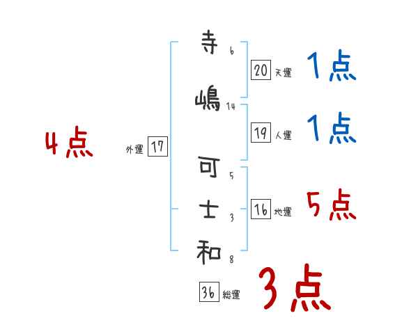 外運![]() | 寺嶋可士和さんの外運は17画の4つ星!積極的な行動力。地位を気づき財産を手に入れる。純粋な心と直感力。 生活面を象徴する運勢です。外部から受ける影響力を表し、結婚運、家庭運や職場、環境への順応性を表します。 |