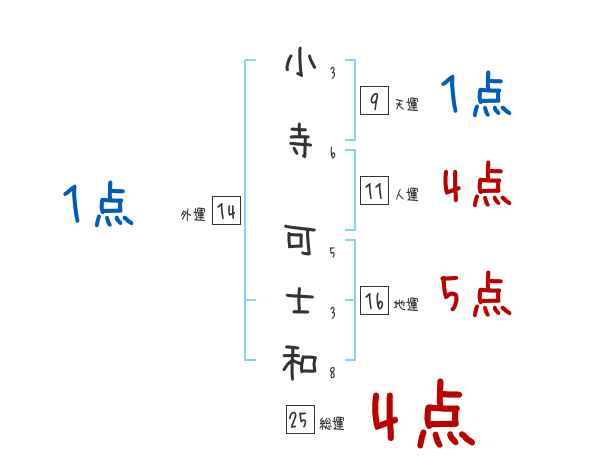 外運![]() | 小寺可士和さんの外運は14画の1つ星!人に対して優しいがストレスを溜め込みがち。人間関係のトラブルを避けるよう気をつけましょう。 生活面を象徴する運勢です。外部から受ける影響力を表し、結婚運、家庭運や職場、環境への順応性を表します。 |