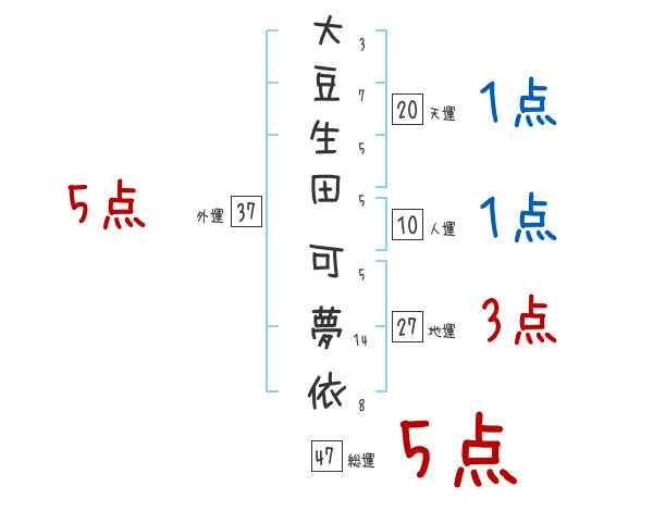 総運![]() | 大豆生田可夢依さんの総運は47画の5つ星!実力が開花し発展する円満な人生。財に恵まれる。 あなたの人生を表す1番重要な運勢です。生涯を通じて影響する総合運となり、主に50歳以降の晩年期に影響を及ぼします。 |