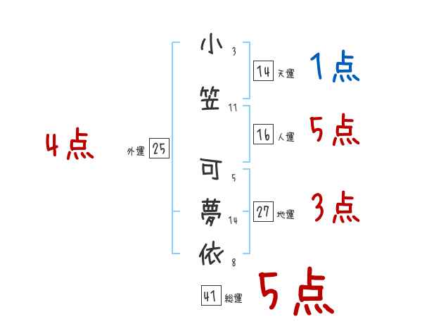人運![]() | 小笠可夢依さんの人運は16画の5つ星!人望が厚く大きく発展する。逆転成功が見える。 性格や才能などを表す2番目に重要な運勢です。人間関係や協調性、社会的な成功に影響します。主に20歳から50歳ぐらいまでの中年期の運勢を表します。 |