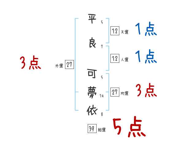 総運![]() | 平良可夢依さんの総運は39画の5つ星!社交性に優れ人望が厚い。人の上に立ち成功する。 あなたの人生を表す1番重要な運勢です。生涯を通じて影響する総合運となり、主に50歳以降の晩年期に影響を及ぼします。 |