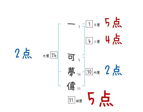天運![]() | 一可夢偉さんの天運は1画の5つ星!行動力、指導力があり出世し繁栄する。幸運に恵まれる。 家系が持つ宿命的な運勢を表します。祖先から受け継いだ苗字ですので自分の力が及びません。家柄を象徴します。 |