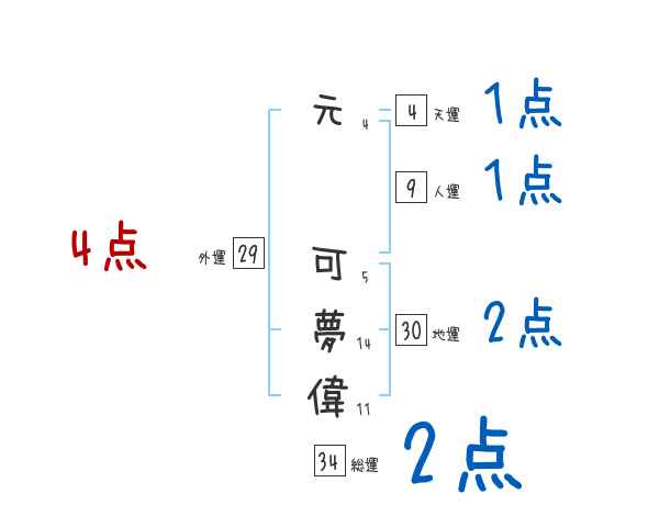 天運![]() | 元可夢偉さんの天運は4画の1つ星!感情が不安定で苦労するかも。周囲との協調を心掛けましょう。 家系が持つ宿命的な運勢を表します。祖先から受け継いだ苗字ですので自分の力が及びません。家柄を象徴します。 |