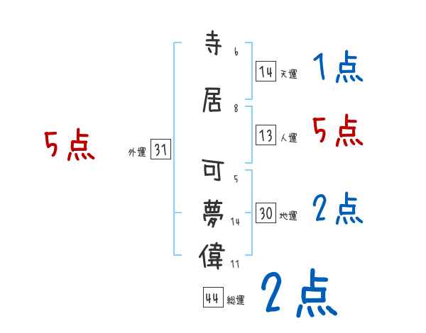 天運![]() | 寺居可夢偉さんの天運は14画の1つ星!人に対して優しいがストレスを溜め込みがち。人間関係のトラブルを避けるよう気をつけましょう。 家系が持つ宿命的な運勢を表します。祖先から受け継いだ苗字ですので自分の力が及びません。家柄を象徴します。 |