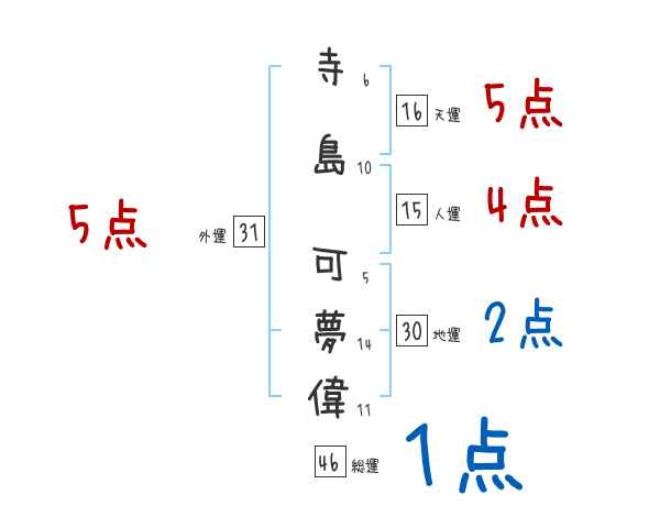 天運![]() | 寺島可夢偉さんの天運は16画の5つ星!人望が厚く大きく発展する。逆転成功が見える。 家系が持つ宿命的な運勢を表します。祖先から受け継いだ苗字ですので自分の力が及びません。家柄を象徴します。 |