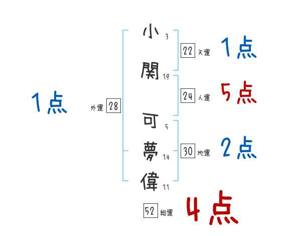 外運![]() | 小関可夢偉さんの外運は28画の1つ星!家庭環境に注意。スポーツで活躍できる能力があるかも。 生活面を象徴する運勢です。外部から受ける影響力を表し、結婚運、家庭運や職場、環境への順応性を表します。 |
