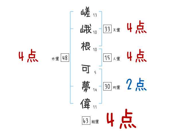 天運![]() | 嵯峨根可夢偉さんの天運は33画の4つ星!権力志向でプライドが高い。勇気があり運を切り開き成功する。 家系が持つ宿命的な運勢を表します。祖先から受け継いだ苗字ですので自分の力が及びません。家柄を象徴します。 |
