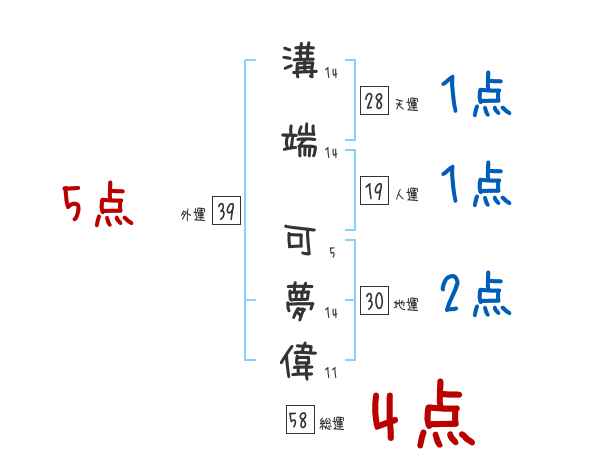 外運![]() | 溝端可夢偉さんの外運は39画の5つ星!社交性に優れ人望が厚い。人の上に立ち成功する。 生活面を象徴する運勢です。外部から受ける影響力を表し、結婚運、家庭運や職場、環境への順応性を表します。 |