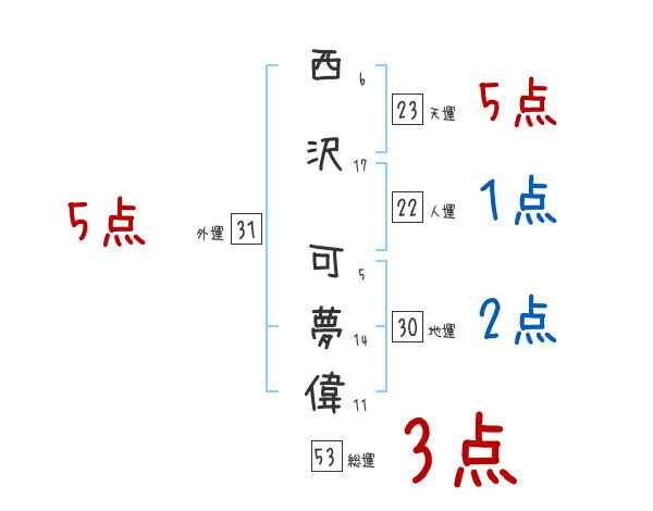 天運![]() | 西沢可夢偉さんの天運は23画の5つ星!想像力に優れ活力がある。一代で成功し名誉を手に入れる。 家系が持つ宿命的な運勢を表します。祖先から受け継いだ苗字ですので自分の力が及びません。家柄を象徴します。 |