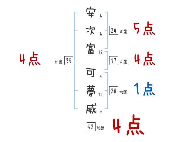 天運![]() | 安次富可夢威さんの天運は24画の5つ星!家庭運が良く順調な人生。金運にも恵まれる。 家系が持つ宿命的な運勢を表します。祖先から受け継いだ苗字ですので自分の力が及びません。家柄を象徴します。 |