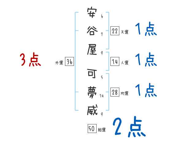天運![]() | 安谷屋可夢威さんの天運は22画の1つ星!努力することが苦手ないっぽう手先が器用。芸術性にも優れる。 家系が持つ宿命的な運勢を表します。祖先から受け継いだ苗字ですので自分の力が及びません。家柄を象徴します。 |