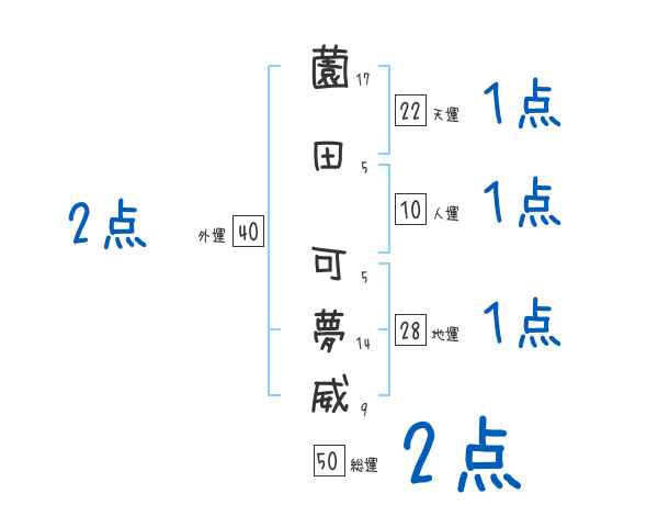 天運![]() | 薗田可夢威さんの天運は22画の1つ星!努力することが苦手ないっぽう手先が器用。芸術性にも優れる。 家系が持つ宿命的な運勢を表します。祖先から受け継いだ苗字ですので自分の力が及びません。家柄を象徴します。 |