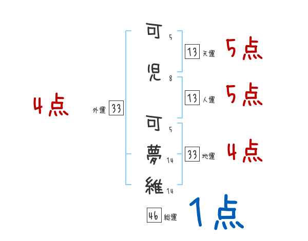 外運![]() | 可児可夢維さんの外運は33画の4つ星!権力志向でプライドが高い。勇気があり運を切り開き成功する。 生活面を象徴する運勢です。外部から受ける影響力を表し、結婚運、家庭運や職場、環境への順応性を表します。 |