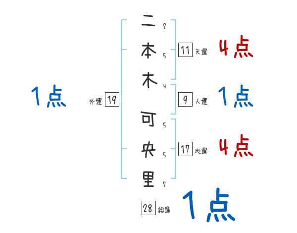 天運![]() | 二本木可央里さんの天運は11画の4つ星!着実に富や地位を得る幸運な人生。 家系が持つ宿命的な運勢を表します。祖先から受け継いだ苗字ですので自分の力が及びません。家柄を象徴します。 |