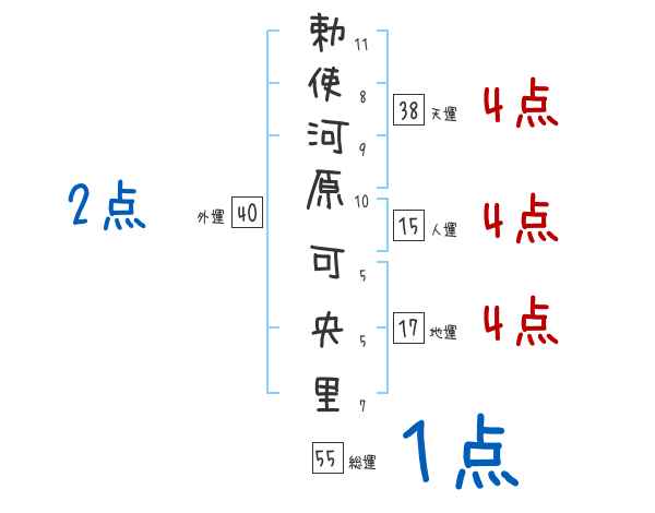 天運![]() | 勅使河原可央里さんの天運は38画の4つ星!温厚な性格で技術的な才能を発揮する。職人的な仕事に向いている。 家系が持つ宿命的な運勢を表します。祖先から受け継いだ苗字ですので自分の力が及びません。家柄を象徴します。 |