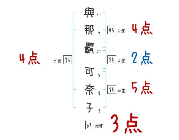 天運![]() | 與那覇可奈子さんの天運は45画の4つ星!もくもくと物事を進め達成する。地味な努力家。 家系が持つ宿命的な運勢を表します。祖先から受け継いだ苗字ですので自分の力が及びません。家柄を象徴します。 |
