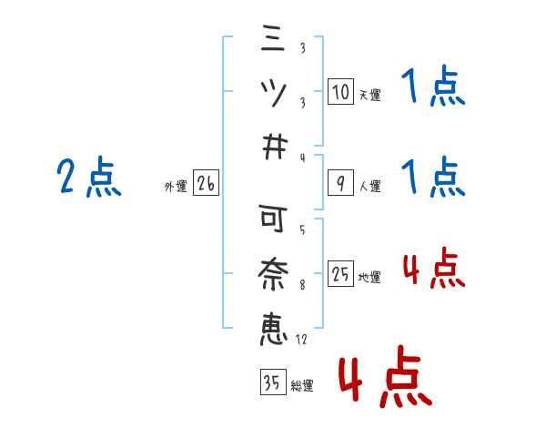 外運![]() | 三ツ井可奈恵さんの外運は26画の2つ星!波瀾万丈かも。信頼できる人を大事にしましょう。 生活面を象徴する運勢です。外部から受ける影響力を表し、結婚運、家庭運や職場、環境への順応性を表します。 |