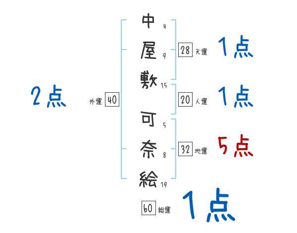 天運![]() | 中屋敷可奈絵さんの天運は28画の1つ星!家庭環境に注意。スポーツで活躍できる能力があるかも。 家系が持つ宿命的な運勢を表します。祖先から受け継いだ苗字ですので自分の力が及びません。家柄を象徴します。 |
