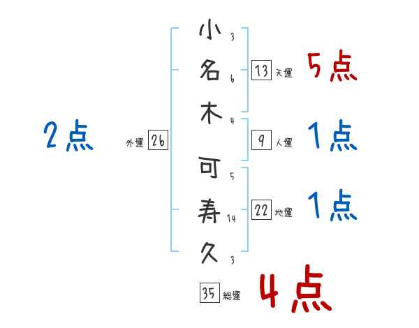 総運![]() | 小名木可寿久さんの総運は35画の4つ星!温厚な性格で感受性が高い。穏和な性格で人望が厚い。 あなたの人生を表す1番重要な運勢です。生涯を通じて影響する総合運となり、主に50歳以降の晩年期に影響を及ぼします。 |