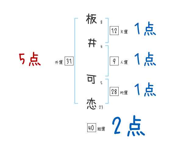 天運![]() | 板井可恋さんの天運は12画の1つ星!簡単な失敗で諦めてしまいやすいかも。着実に行動すると良いでしょう。 家系が持つ宿命的な運勢を表します。祖先から受け継いだ苗字ですので自分の力が及びません。家柄を象徴します。 |