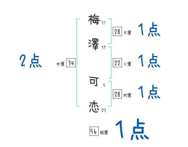 外運![]() | 梅澤可恋さんの外運は34画の2つ星!独創性に優れるが、自尊心が強く災難に注意しましょう。 生活面を象徴する運勢です。外部から受ける影響力を表し、結婚運、家庭運や職場、環境への順応性を表します。 |