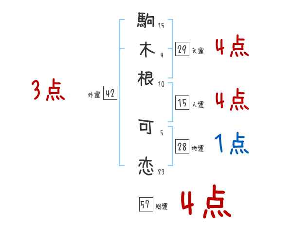 天運![]() | 駒木根可恋さんの天運は29画の4つ星!完全主義で才能がある。厳格な心の持ち主。 家系が持つ宿命的な運勢を表します。祖先から受け継いだ苗字ですので自分の力が及びません。家柄を象徴します。 |